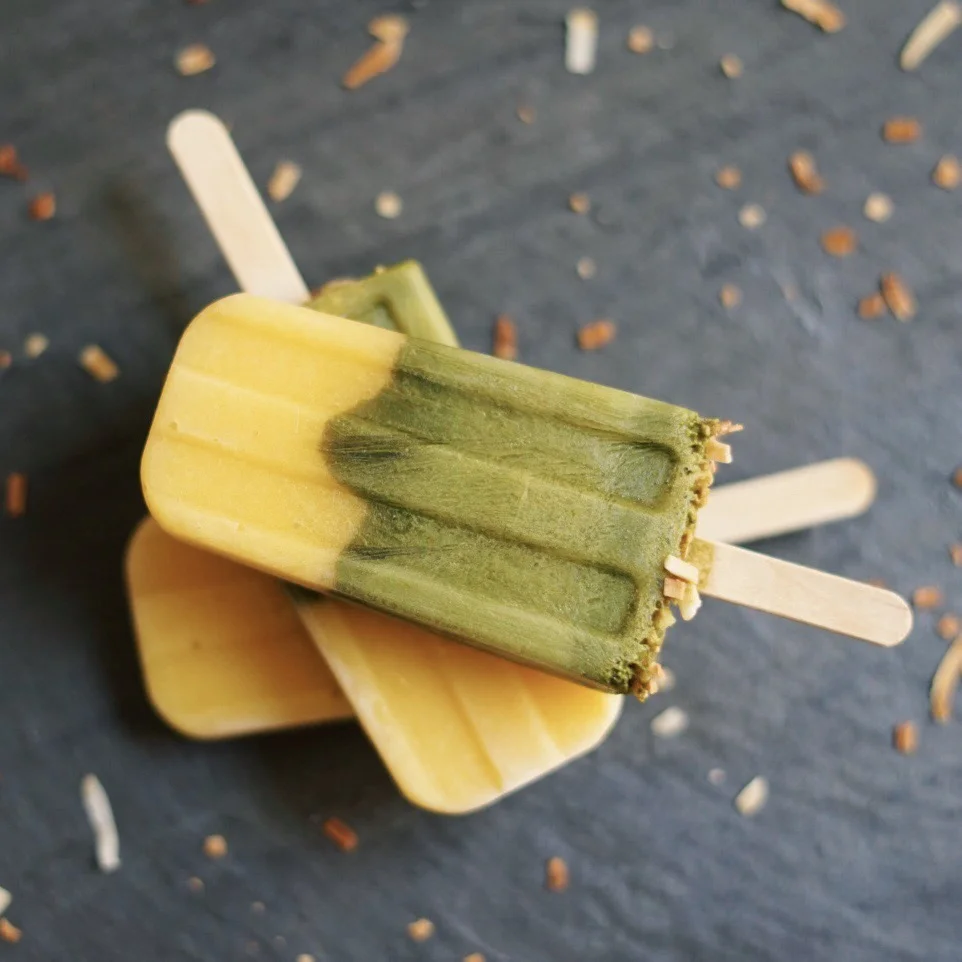Pour matcha mixture on top of the mango mixtures in the molds. Insert popsicle sticks and place mold back in freeze for a least 4 hours